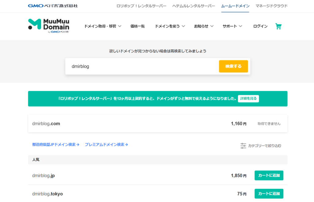ムームードメインは、国内最大級のドメイン取得サービスです。選べるドメインは620種類以上。サイトやメールアドレスをすぐに作成できるムームーサーバーなら初期費用0円+ドメインもずっと0円でご利用いただけます。まずはドメイン検索から。